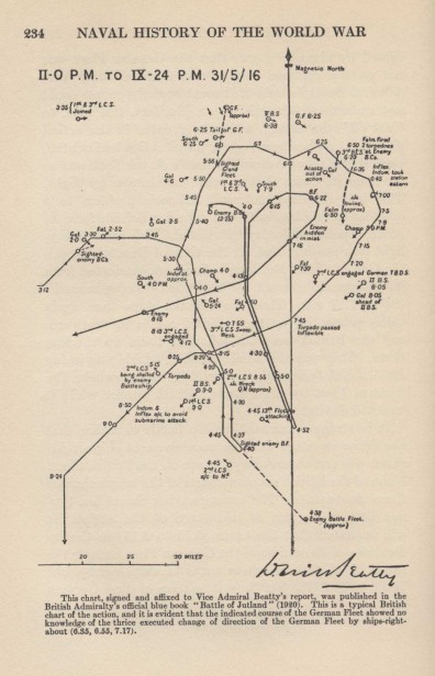 When the battle started, Jellicoe and the rest of the Grand Fleet were seventy miles away from Beatty. Because of this, Jellicoe only arrived at the battle at 1740 hours (Warships 83). Jellicoe’s arrival at the battle was aided by Beatty leading Scheer and Hipper North, to the rest of the Grand Fleet. Hipper and Scheer, believing they were heading to a base, seemed to forget that all British bases were to the east, allowing Beatty to lead the High Seas Fleet directly to Jellicoe, initiating the full-scale encounter Scheer so desperately wanted to avoid (Warships 83).